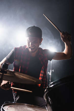 Curly musician shouting, while holding drumsticks and sitting at drum kit with backlit on background