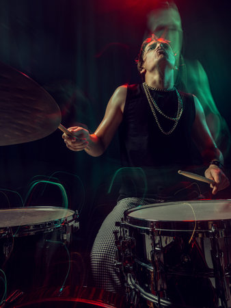 Drummer performing under red and green lights with motion blur and focus. Concept of speed, rhythm, energy, motivation, and creative advertising for music visuals and performance art.