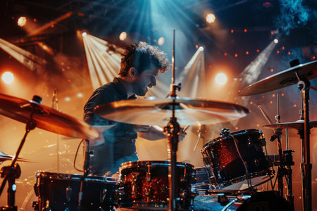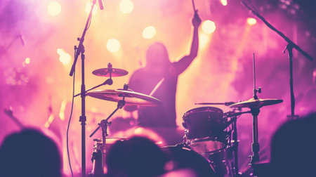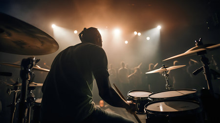 Rhythm Pulse: Drummer Captures the Beat in Candid Stage Moment. AI-generated