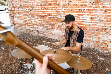 Repetition of rock music band. Drummer behind the drum set. Rehearsal base