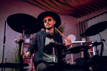 Professional drummer in trendy hat and sunglasses using sticks and electronic drums for creating new music rhythm. Concept of inspiration.