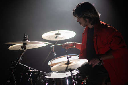 Concentrated young man playing drum set at concert. Portrait of musician performing on drum set or rehearsing in studio. Drummer training concept
