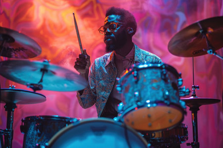 A picture of the man behind the drums in a neon atmosphere, creating a magic of sounds filled with rhythm and energy.