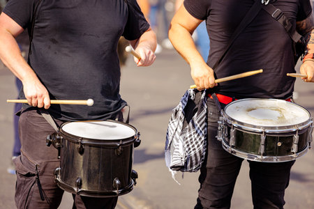 Close-up of marching band drummers in colorful uniforms playing snare drums during a parade, showing rhythm, teamwork, and vibrant festive spirit.
