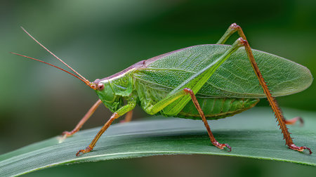 A vibrant green grasshopper is resting on a green leaf blending into its lush surroundings in a natural habitat.