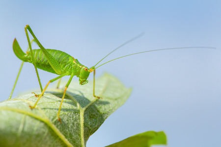 Green grasshopper insect with long legs and feelers on leaf with sky