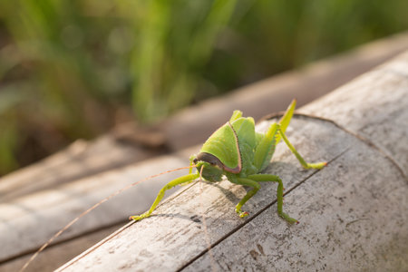 Green bush cricket or long-horned grasshopper licking legs on wooden floor, blur bokeh background with copy space