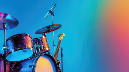 A colorful drum set accompanied by a guitar and microphone stands against a gradient background, ideal for music-themed projects, promotions, or events.