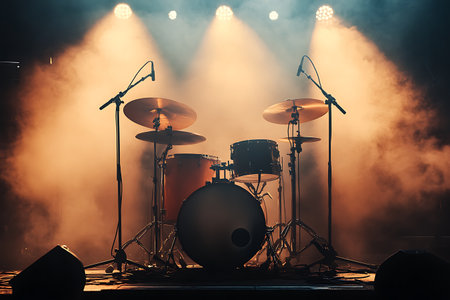 drum kit on stage with spotlight and smoke, created with generative ai
