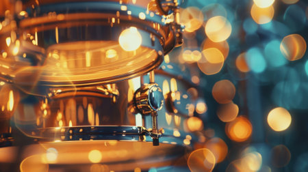 Abstract reflections from stage lighting rigs on metallic instruments and surfaces