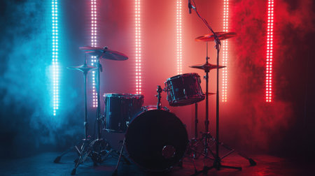 A captivating drum set illuminated by striking neon lights and enveloped in a foggy atmosphere, perfect for music-themed projects.