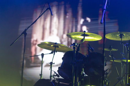 Drum kit on stage in smoke and fog. Musical instrument. Selective focus