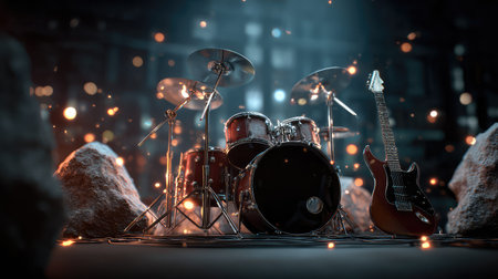 Drum kit and electric guitar glowing on stage