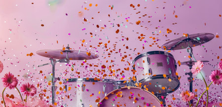 Vibrant Drum Set with Confetti Explosion and Floral Accents on Pink Background.