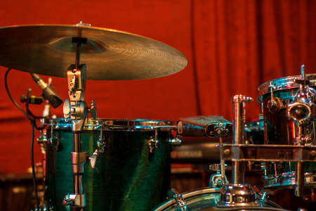Green drum set on red background. Percussion instruments at a jazz concert. Drum and plates are on the stage of the concert hall