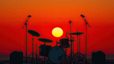 A striking silhouette of a drum set and microphones against a stunning sunset, capturing the essence of musical performance and vibrant outdoor ambiance.