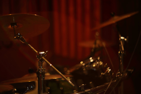 A set of plates in a drum set. At a concert of percussion music, selective focus, close-up