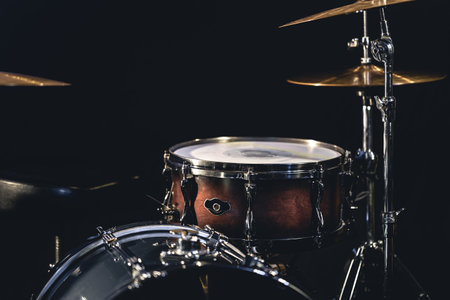 Close-up of a snare drum, percussion instrument on a dark background with beautiful lighting, copy space.