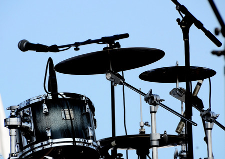 Details of the drum set on the scene close-up. Musical instruments and musical performance. Drums. Hi-Hat, tam-tam, Microphone close up.
