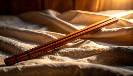 Realistic single light brown bamboo chopstick placed diagonally on soft wrinkled white linen fabric, natural morning light, minimal calm setup