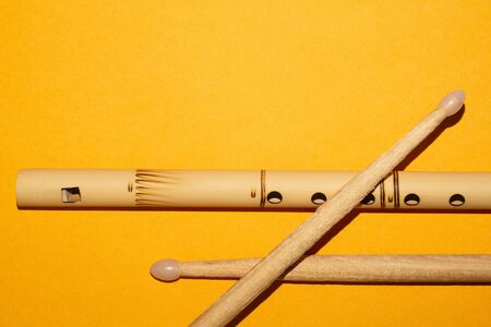 Bamboo bansuri flute and drumsticks. simple music instruments