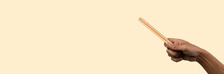 Black male hand holding a vintage or antique ruler isolated on yellow banner