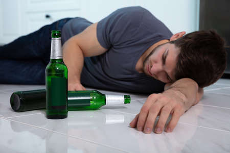 Alcoholic Man Lying On Floor With Beer Bottles In Kitchen