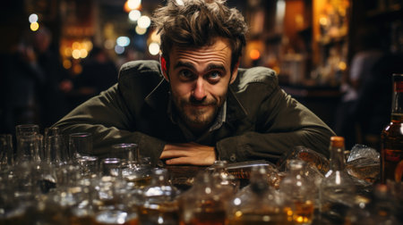 Portrait of a drunk man in a pub. Alcohol addiction concept.