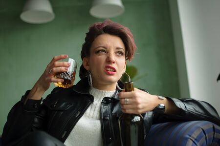 Young sad woman with dark pink hair with glam rock style look is drinking whisky from a glass with abomination grimace on the face, female alcoholism, alcohol addiction