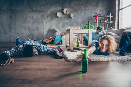 Photo of unwell being blonde hair man have lifestyle crazy party with fellows feel hangover want drink reach hand bottle lie floor pals sleep in house indoors
