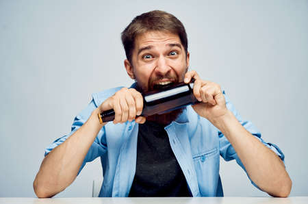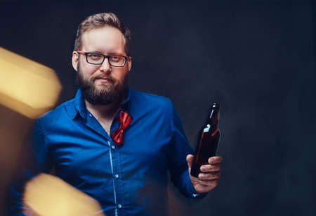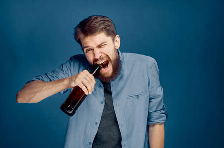 Man with a beard on a blue background holds a bottle of beer, alcohol.