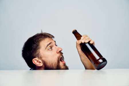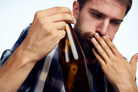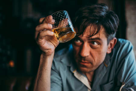 Upset man drinker alcoholic with glass drinking whiskey alone, sad depressed addicted. Man with bottle of beer, close up face.