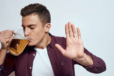 Drunk man with a mug of beer vacation alcohol lifestyle in a red shirt emotions light background