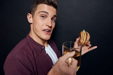 man with beer mug and hamburger in hands fun lifestyle studio dark isolated background