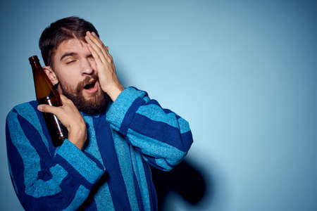 Man alcoholic with a bottle of beer in his hand and in a blue dressing gown cut off with Copy Space