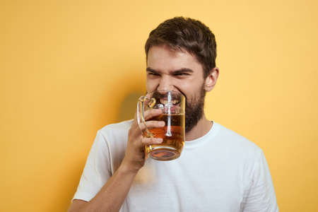 Man with a mug of beer on a yellow background white t-shirt emotions Copy Space