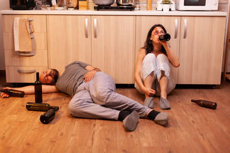 Wife drinking alcohol near drunk husband looking desolated at him. Traumatised abused terrified beaten woman covered in bruises suffering injury from alcoholic aggression brutal violent man.
