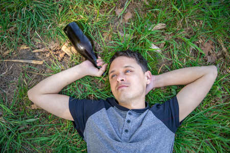 drunk man with a bottle of alcohol in his hand lying on a green field