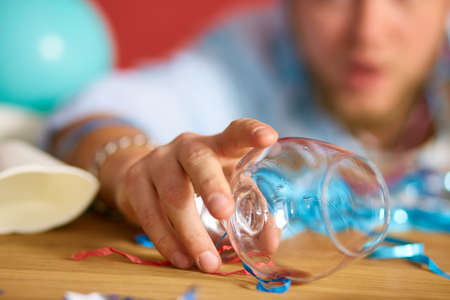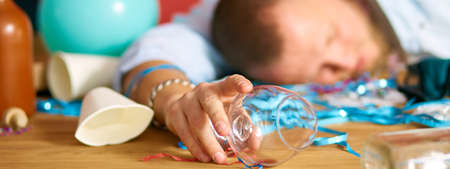 Banner of Close up of hand man hold a glass of brandy, sleeping at table in messy room after bachelor party, tired man after party at home