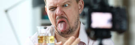 Portrait of man making face holding glass with alcoholic drink. Macro shot of male showing tongue. Videocamera filming on tripod. Beginner blogger concept