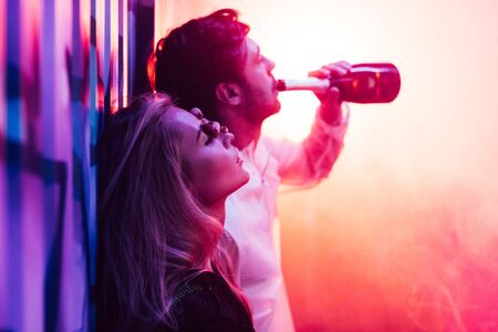 attractive and blonde woman with closed eyes and handsome man drinking champagne