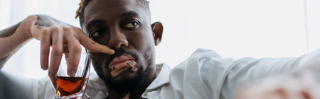African american man with vitiligo in white shirt holding glass of whiskey at home, banner