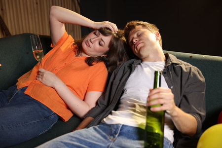 Looking awful. Exhausted young man feeling terrible after big party and looking at the bottle of beer while his tired girlfriend sleeping