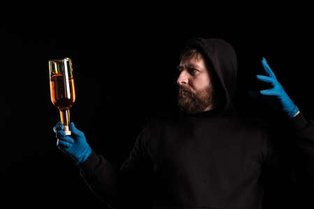 a man in a hood holds a bottle of alcohol in his hand, the other hand is free. theatrical performance on stage