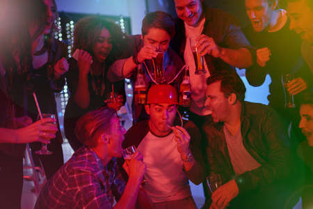 cropped shot of friends pouring beer in funnel and man drinking while lying on table