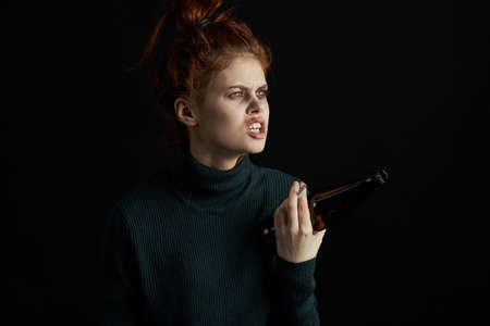woman with bottle of alcohol bruises under eyes changes depression dark background