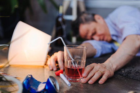 Drunk man sleeping in a messy bar. Alcohol addiction concept.