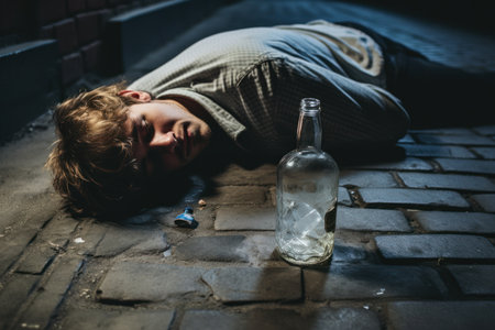 Distressed man lying on sidewalk at night near empty bottle