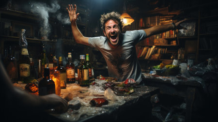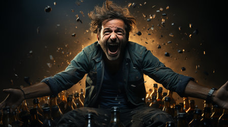 Angry bearded man with addiction screaming and lots of empty bottles and fragments fly around.