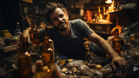 Happy bearded man with alcohol addiction. lots of bottles and waste around.
